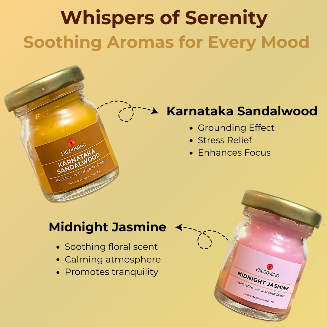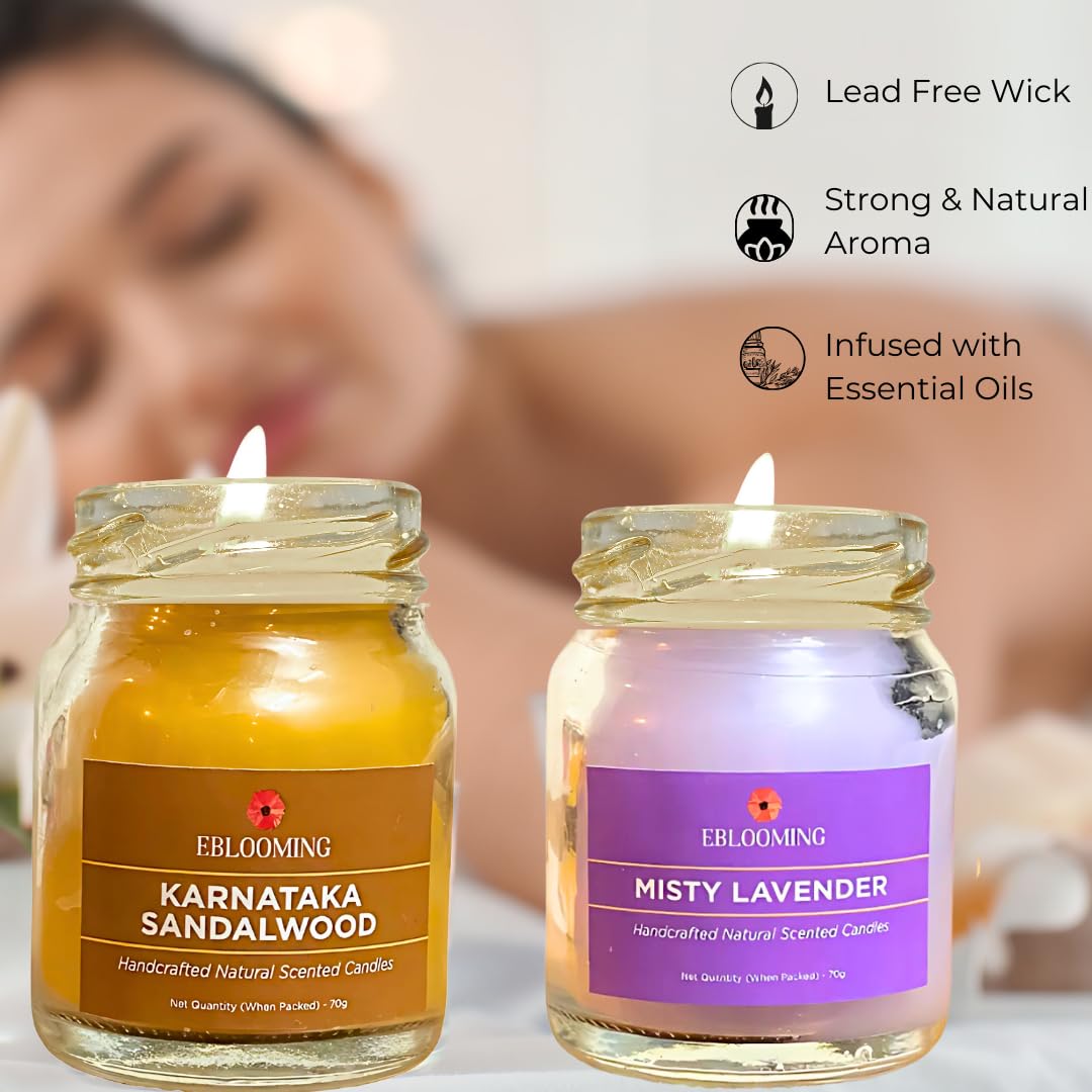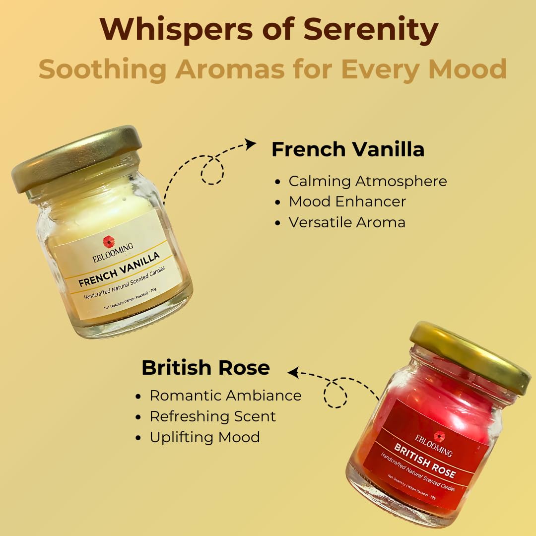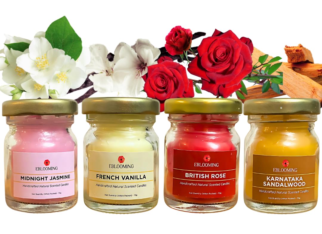 Indulge your senses with Eblooming Organic Scented Candles, where luxury meets relaxation in every flicker. This set of 8 exquisitely crafted candles, each weighing 70 GMS, brings the aromatic bliss of Vanilla, Rose, Sandalwood, Jasmine, Lemongrass, Lavender, Oud, and Chocolate to your home.